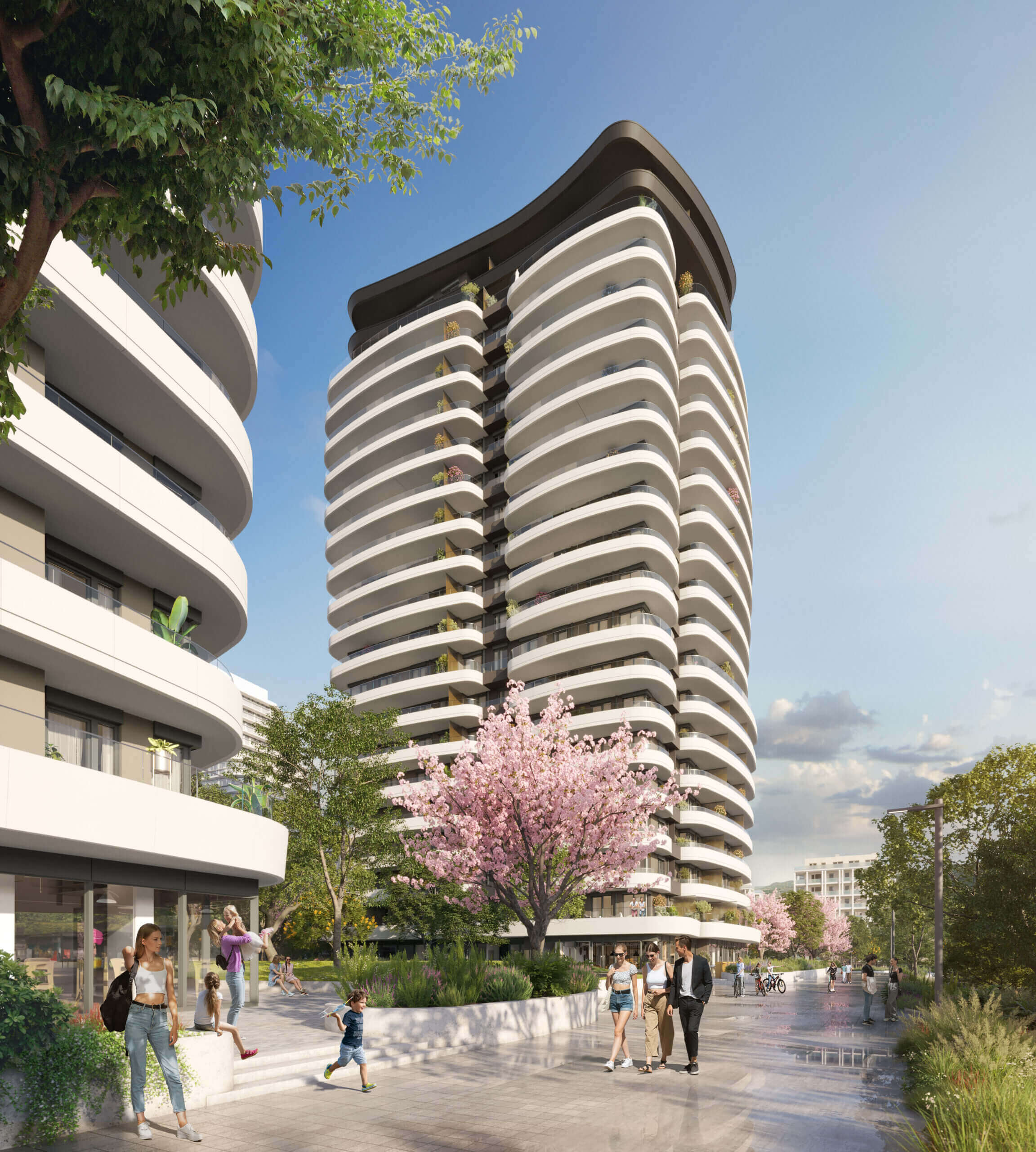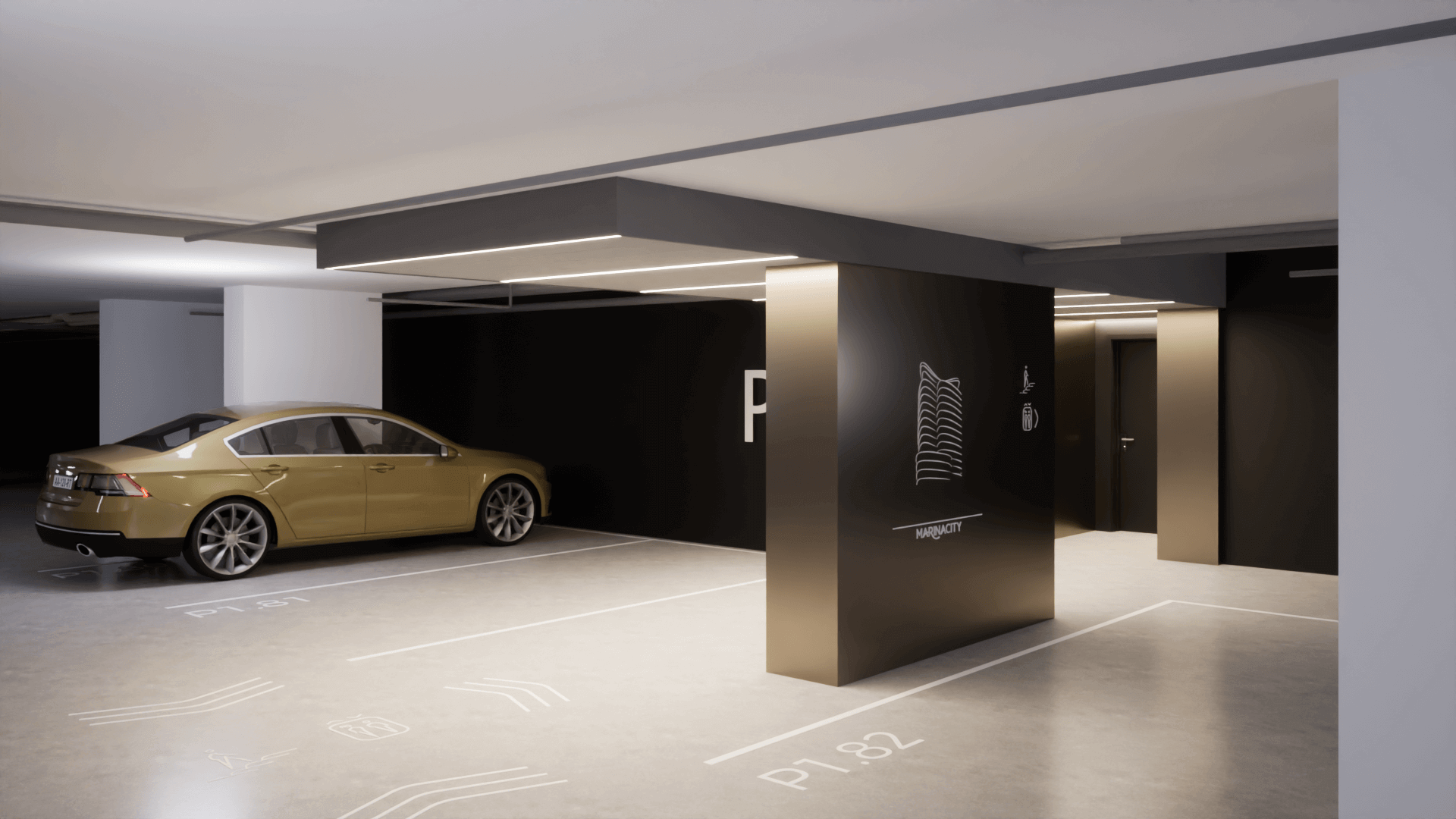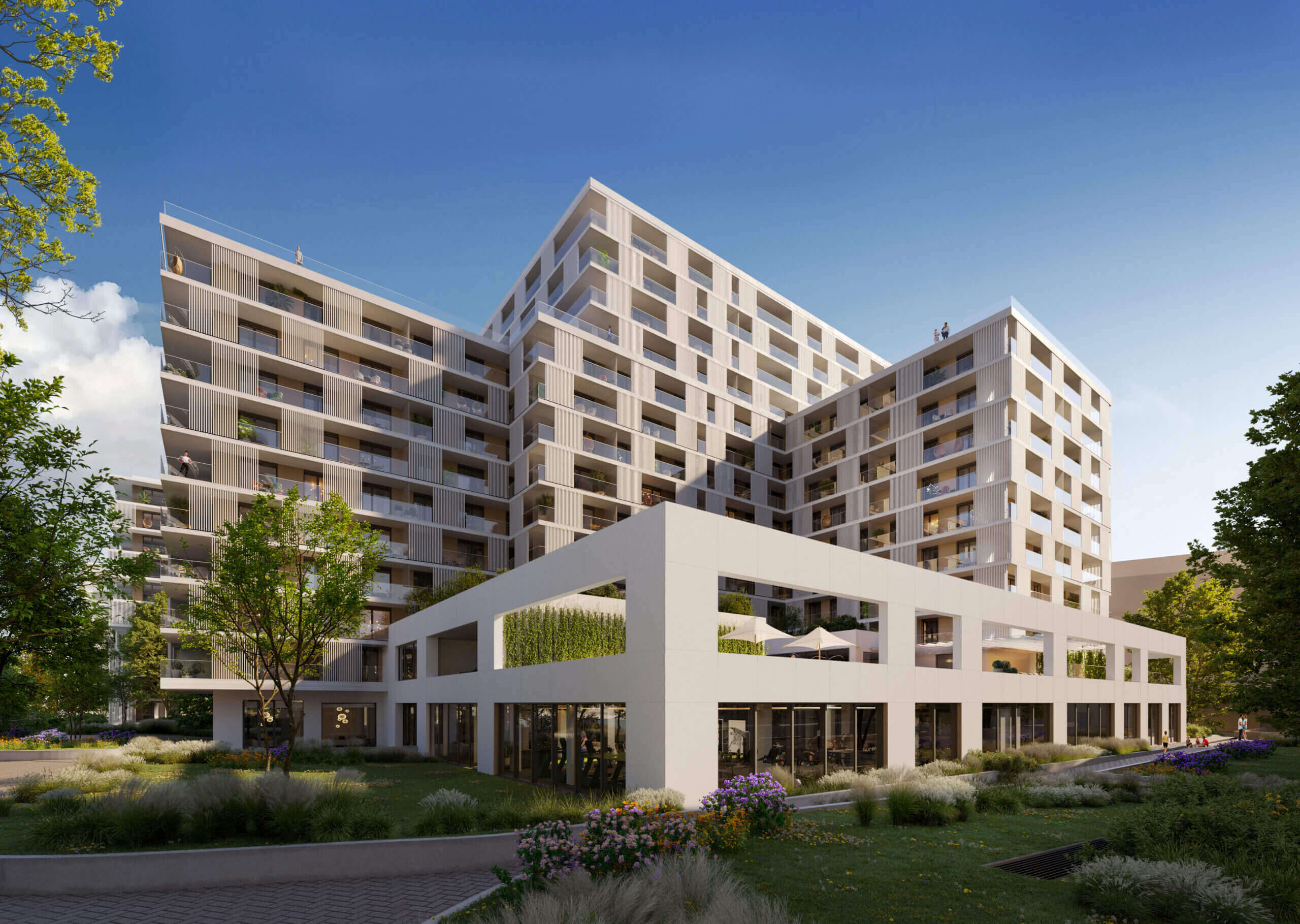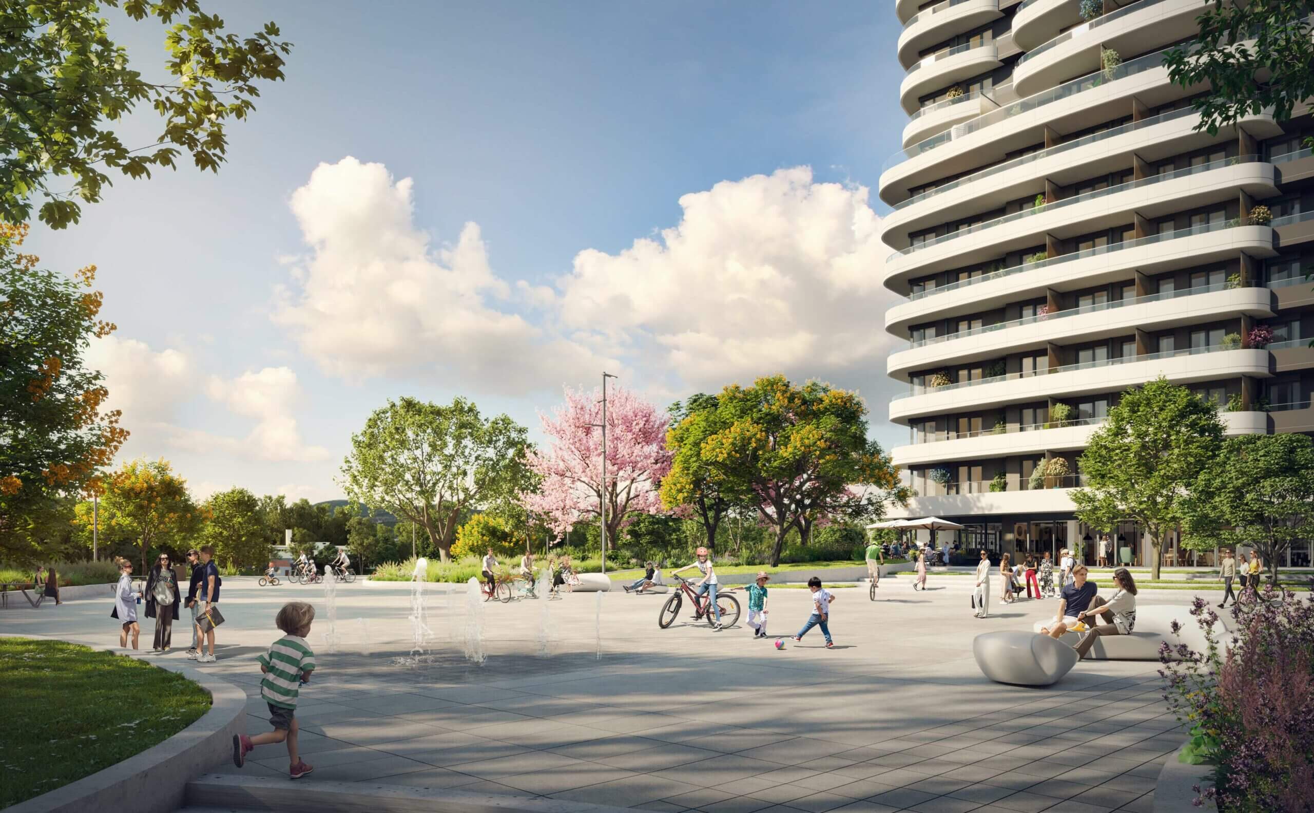 A felszín alatti tágas parkolók garantálják a parkosított zöldterület zavartalanságát, miközben teljes kényelmet nyújtanak a lakóknak és az autóval érkezőknek.