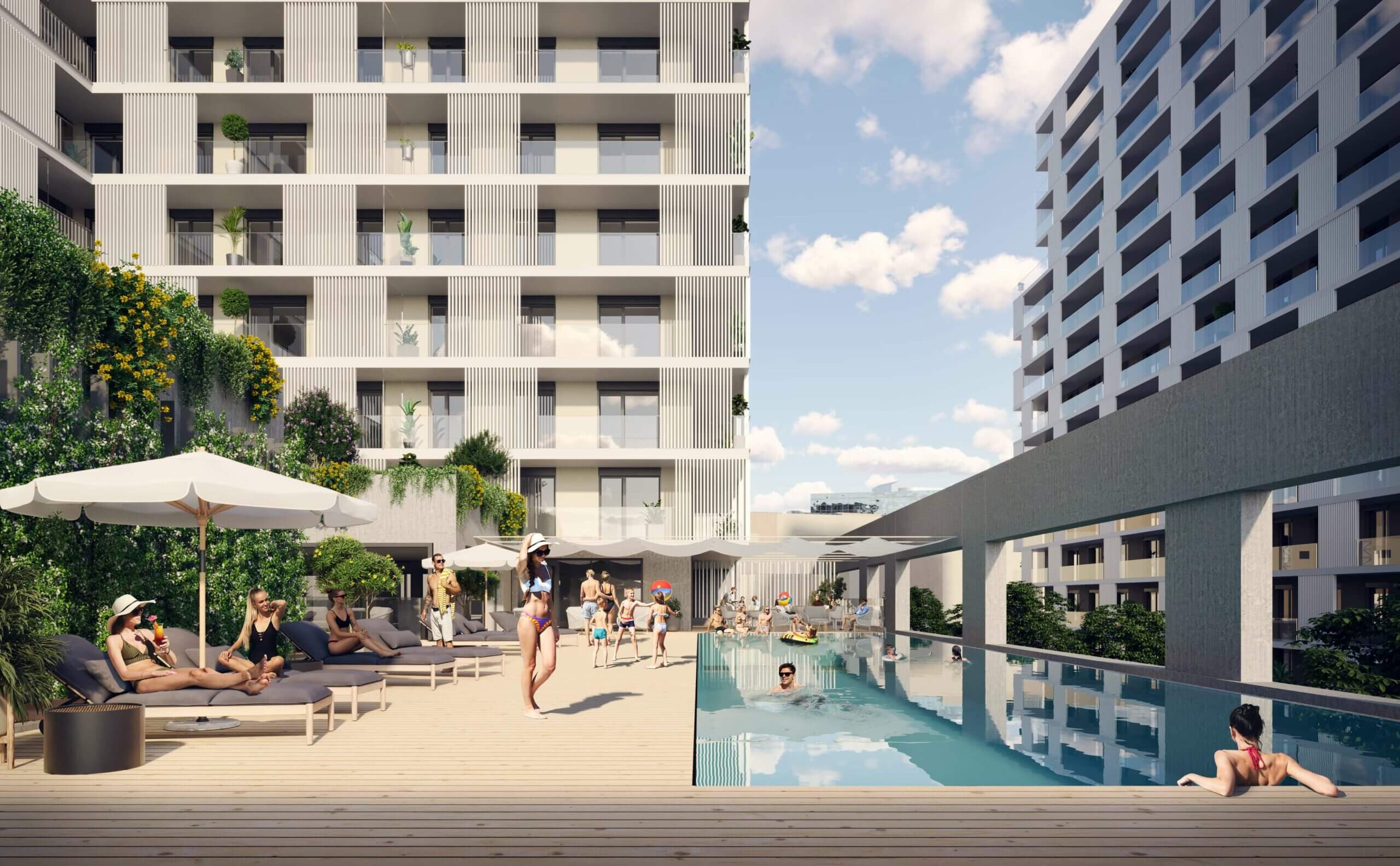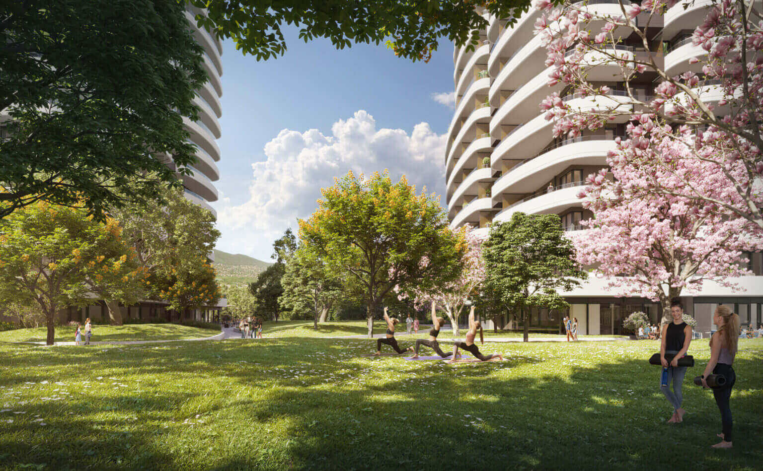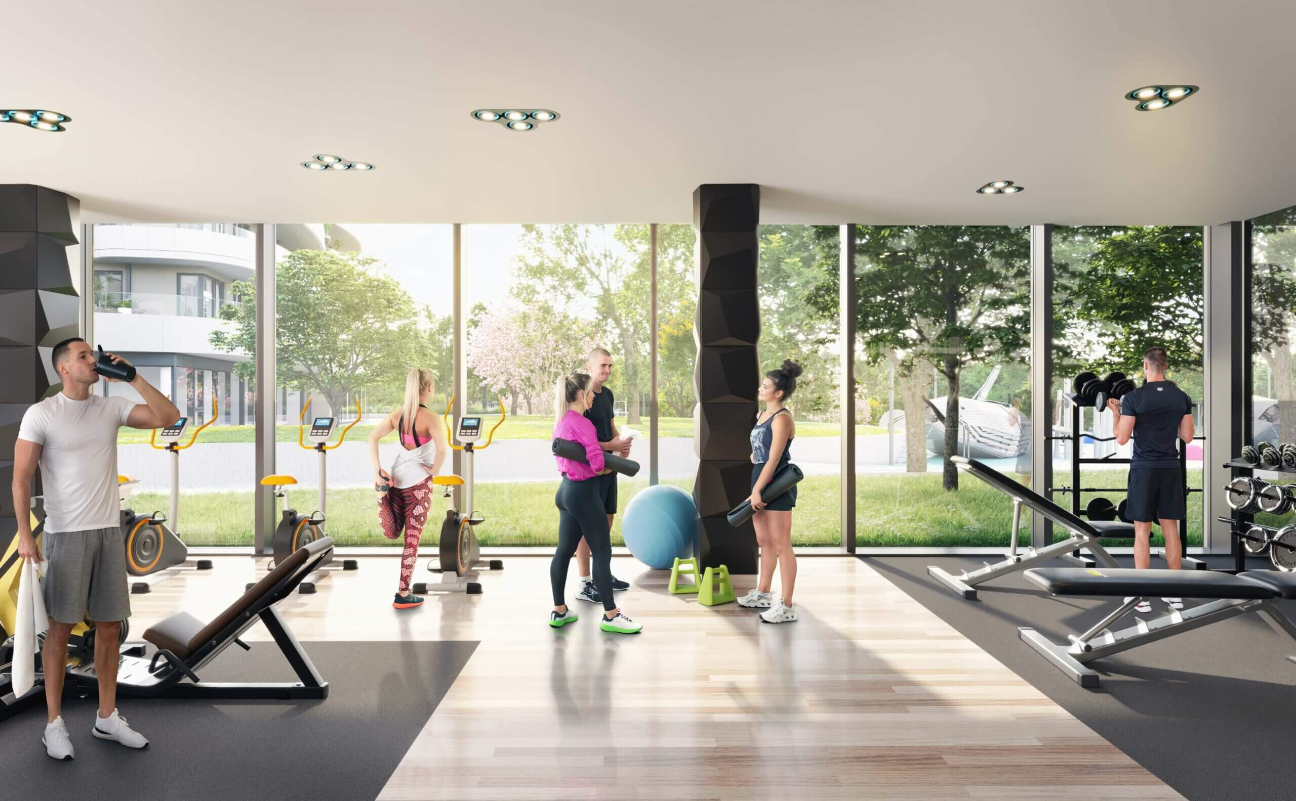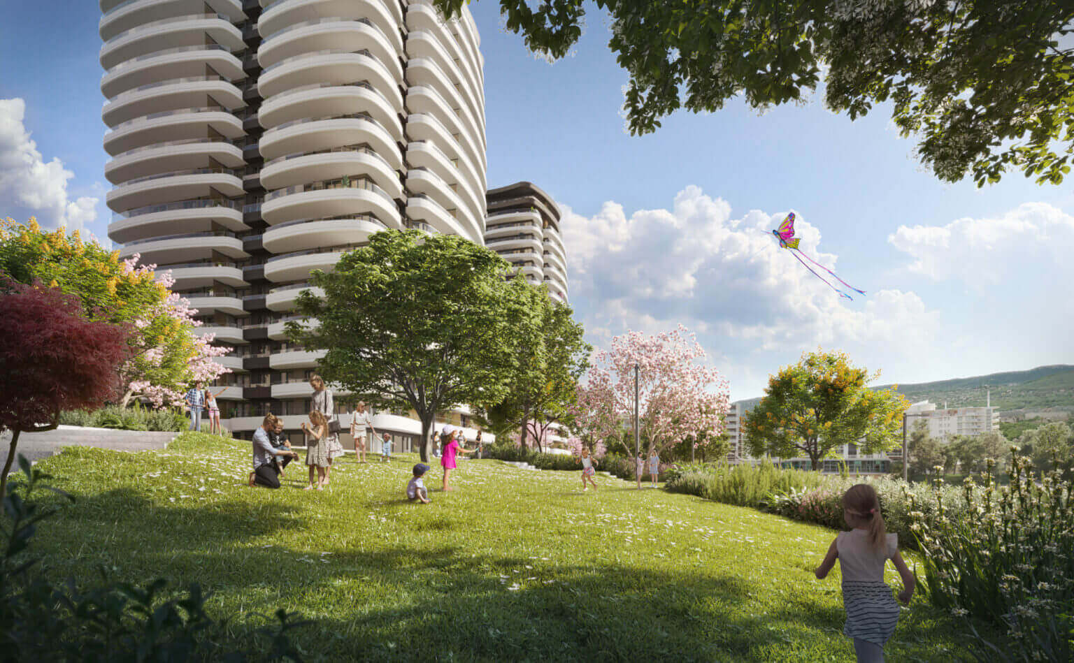 A felszín alatti tágas parkolók garantálják a parkosított zöldterület zavartalanságát, miközben teljes kényelmet nyújtanak a lakóknak és az autóval érkezőknek.